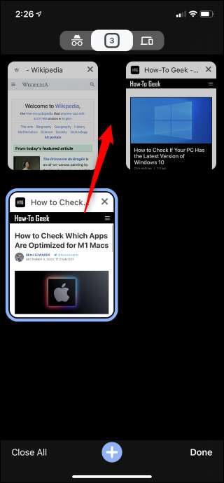 Para aprovechar mejor el gesto de las pestañas de Swipe-to-Switch, puede volver a colocar sus pestañas abiertas. Para hacer esto, toque el icono "Switch Tabs" en la parte inferior de la aplicación Chrome para ver todas sus pestañas abiertas. (Parece un cuadrado redondeado con un número.)