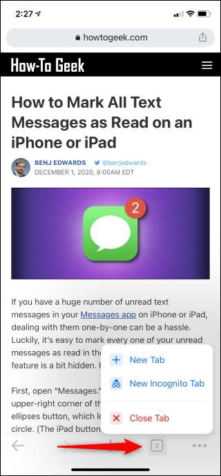 Para encontrar estas opciones de administración de pestañas, presione LARGO en el botón "Tabla de conmutación" en la barra de herramientas. Aquí, puede tocar "Nueva pestaña de incógnito" para abrir rápidamente una pestaña de incógnito para la navegación privada, o puede tocar "Cerrar pestaña" para cerrar la pestaña actual.