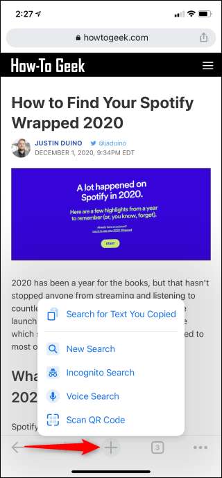 Toque "Nueva búsqueda" para abrir una nueva pestaña con el campo de búsqueda enfocado para que pueda comenzar inmediatamente a escribir, o toque "búsqueda de incógnito" para hacer lo mismo con un nuevo Pestaña de incógnito . Si desea buscar con su voz o escanee un código QR, toque la "Búsqueda de voz" o las opciones de "Analizar código QR" aquí.
