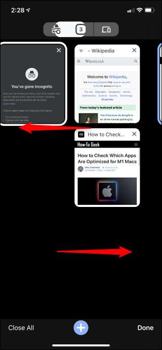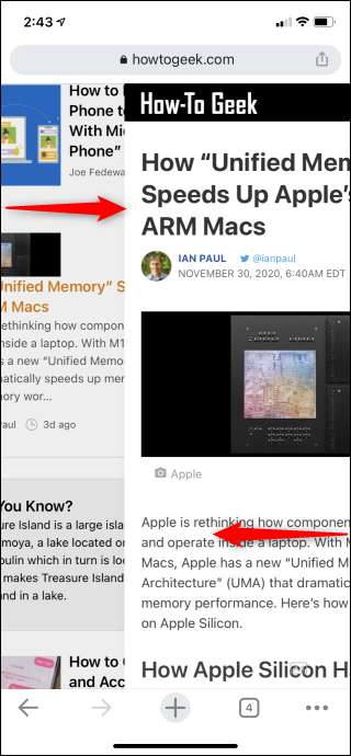 Para cambiar entre ellos, puede deslizarse hacia la izquierda o hacia la derecha en cualquier lugar de la pantalla del conmutador de la pestaña. Es mucho más fácil, y nunca tendrá que ajustar su agarre para tocar esos objetivos pequeños en la parte superior de la pantalla de su iPhone.