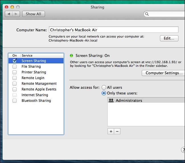 Este panel de control le informará cómo puede conectarse. Si tiene otra Mac en la red local, puede abrir una ventana del Finder, buscar en la sección Compartida de la barra lateral, seleccionar la computadora que desea controlar y hacer clic en Compartir pantalla. Si no tiene una Mac o desea utilizar otro cliente VNC, puede conectarse a la dirección IP que se muestra aquí. Tenga en cuenta que la dirección IP que se muestra arriba probablemente sea una dirección IP interna donde se puede encontrar su Mac en su red local, lo que significa que no puede acceder a ella a través de Internet sin puertos de reenvío.