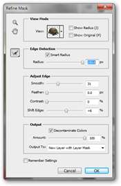El "Smart Radius" es donde está toda la acción. Puede ajustar su máscara con la detección de bordes incorporada de Photoshop, que puede enmascarar con mucho cuidado datos de imágenes difíciles, como el cabello.