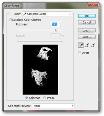 Usando su herramienta de cuentagotas ( tecla de atajo: I ) elija un color de su imagen, luego navegue hasta Seleccionar> Gama de colores. La herramienta de rango de color cargará una selección de ese color, que puede controlar con la herramienta deslizante, que se muestra arriba a la derecha. Es posible que Photoshop piense que el color que está utilizando es similar a colores que no ve tan similares, pero la gama de colores es bastante útil para cargar selecciones y crear máscaras, no obstante.