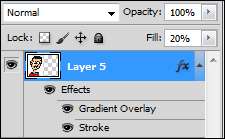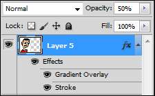 El relleno afecta el canal alfa de los píxeles opacos en una capa; si usa efectos de capa en dicha capa, no se ven afectados. Para una demostración más clara de esto, mire el ejemplo de la derecha, con los efectos de capa (Trazo y Superposición de degradado) mezclándose con el fondo cuando la “Opacidad” se establece en 50%. El ejemplo de la derecha reduce la apariencia del logotipo geek sin reducir la apariencia del degradado y el trazo.