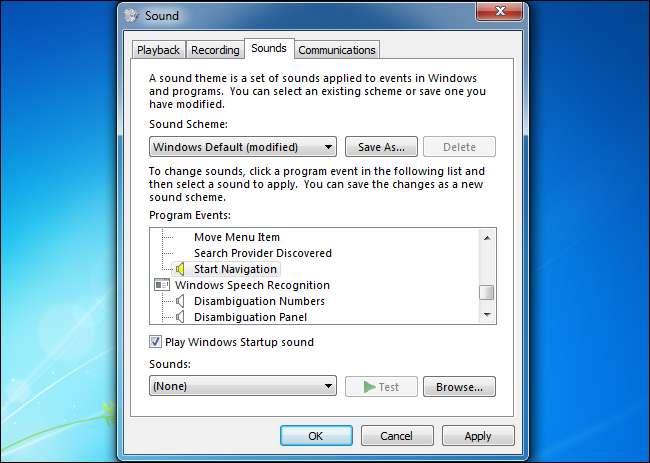 Para deshabilitar solo este sonido, desplácese hacia abajo en la lista y seleccione el efecto de sonido "Iniciar navegación". Haga clic en el cuadro "Sonidos" en la parte inferior de la ventana y seleccione "(Ninguno)". Haga clic en "Aceptar" para guardar sus cambios.
