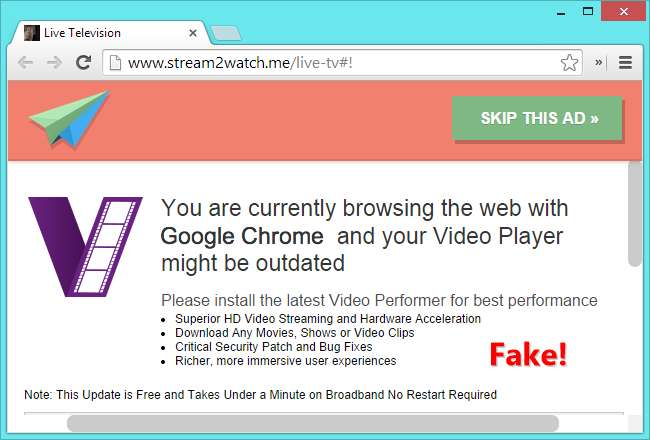 Por lo general, solo se encontrará con estos anuncios fraudulentos en sitios de transmisión de video de baja calidad. Pero es posible que se encuentre en un sitio de este tipo después de hacer clic en un enlace en las redes sociales o en otro lugar, no se deje engañar.
