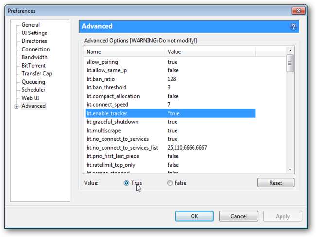 Haga clic en "bt.enable_tracker" y cambie el valor a True. Luego, haga clic en Aceptar y reinicie uTorrent para que los cambios surtan efecto.