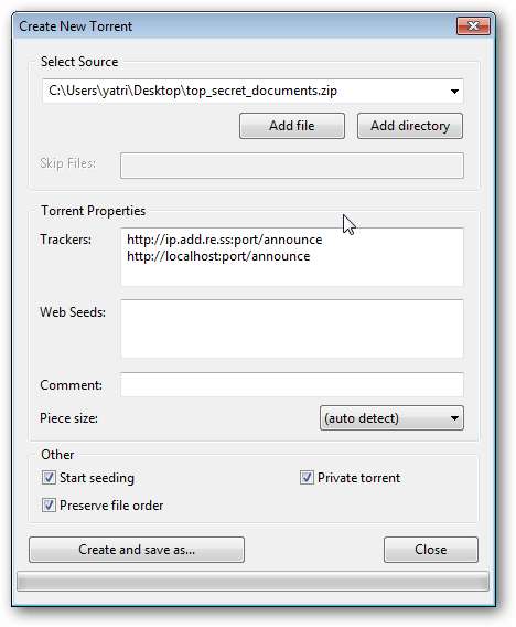 La parte "localhost" es una referencia reflexiva que le dice a uTorrent que cualquier computadora en la que se esté ejecutando también es un rastreador válido. Asegúrese de que Private Torrent también esté marcado. Esto evita compartir el torrent usando otros métodos como PEX y DHT. Ahora, a menos que alguien tenga el torrent que creó, no puede descargar su contenido.