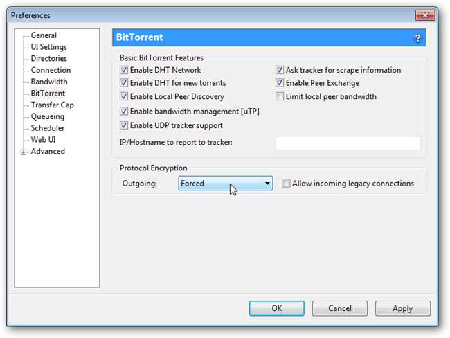 Para mayor seguridad, puede forzar el cifrado en las conexiones salientes. Vaya a Opciones> Preferencias, luego haga clic en BitTorrent.