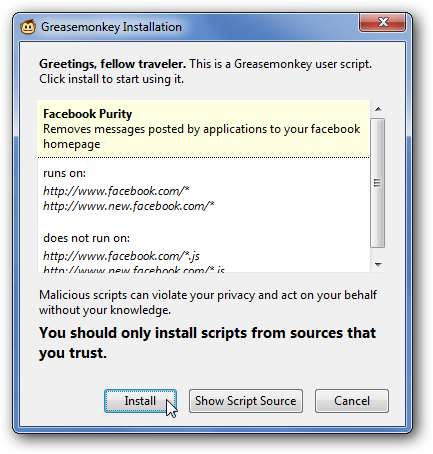 Deberá asegurarse de instalar primero el Extensión Greasemonkey y reinicia Firefox, si aún no lo has hecho. Una vez que lo hayas hecho, dirígete a la página de instalación de Facebook Purity, haz clic en el botón Instalar y se te pedirá que instales el script.