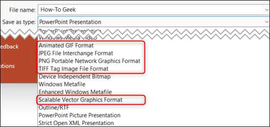 Navegue a la ubicación que le gustaría guardar el archivo y luego, en el cuadro "Guardar como", elija el tipo de archivo de imagen que le gustaría guardar la presentación. Puedes elegir entre: