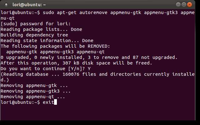 Se eliminan tres paquetes y vuelve al indicador. Para cerrar la ventana de Terminal, escriba "salir" (nuevamente, sin las comillas) y presione Enter.