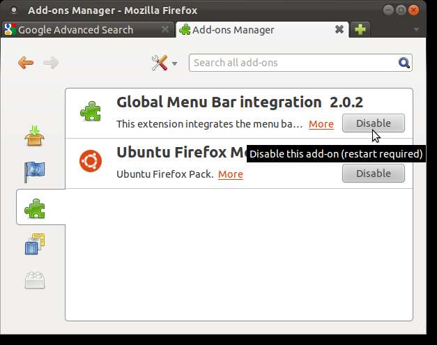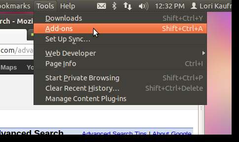 La eliminación de la función Menú global no la elimina de las ventanas de Firefox. Para hacer esto, debe deshabilitar el complemento de integración de la barra de menú global en Firefox. Para hacer esto, seleccione Complementos en el menú Herramientas en Firefox.