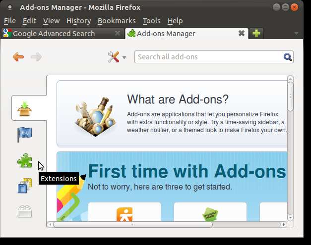 El Administrador de complementos se abre en una nueva pestaña. Haga clic en la pestaña Extensiones (con el icono de la pieza del rompecabezas) para ver la lista de extensiones instaladas actualmente.