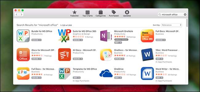 También hay varias aplicaciones de $ 20 + que ponen La versión en línea gratuita de Microsoft de Office en un navegador dedicado. Luego están las "aplicaciones" reales capaces de abrir y editar archivos de Office, muchas de las cuales usan términos como "Microsoft Word" en sus nombres. Parecen ser versiones ligeramente modificadas de aplicaciones de código abierto, pero no vamos a comprarlas para averiguarlo.