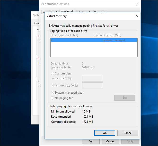 - Desactivar el archivo de página : Esta no es una gran idea porque algunos programas simplemente no se ejecutan correctamente sin un archivo de paginación , incluso si tiene mucha RAM. Windows preferirá usar su RAM si tiene RAM disponible, por lo que un archivo de página no ralentizará nada. Tener un archivo de página puede resultar en más escrituras en su SSD y ocupar espacio en él, pero nuevamente, eso no es un problema con los SSD modernos. Windows administra automáticamente el tamaño de su archivo de página.