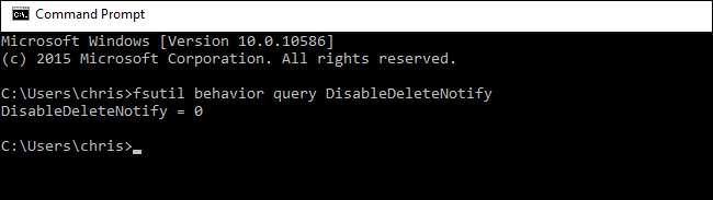 Para comprobarlo, abra una ventana del símbolo del sistema y ejecute el comando "consulta de comportamiento fsutil DisableDeleteNotify". Si está configurado en "0", TRIM está habilitado y todo está bien. Si está configurado en "1", TRIM está deshabilitado y debe habilitarlo. Sin embargo, esto es raro.