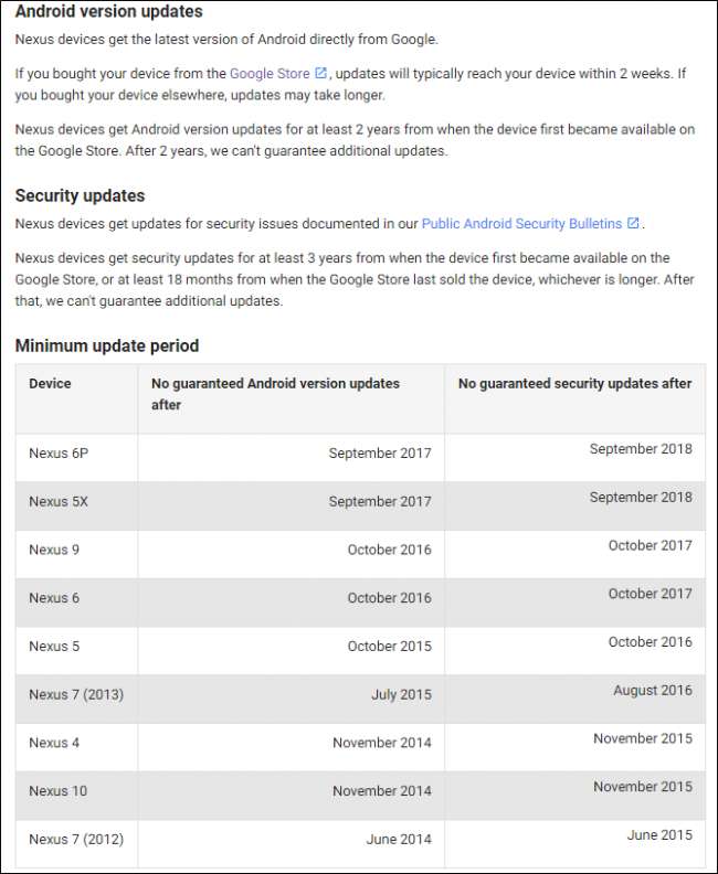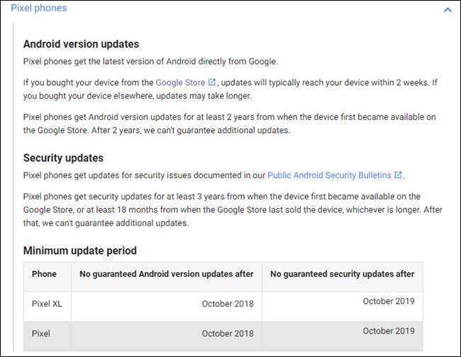 Esa es la única comparación real que se puede usar de manera justa: es una comparación de manzanas con manzanas, a falta de una mejor analogía. La postura oficial de Google sobre las actualizaciones de Nexus y Pixel es bastante sencilla: estos teléfonos reciben actualizaciones de la versión de Android durante "al menos 2 años desde que el dispositivo estuvo disponible por primera vez en Google Store" y actualizaciones de seguridad "durante al menos 3 años desde que el dispositivo se puso por primera vez estuvo disponible en Google Store, o al menos 18 meses desde la última vez que Google Store vendió el dispositivo, lo que sea más largo. “Eso es directamente de la boca de Google.