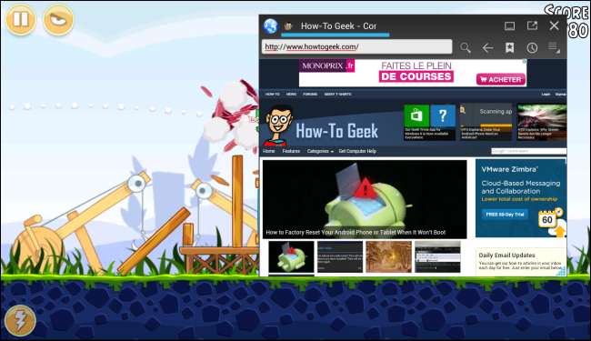 Dos navegadores flotantes populares son Flujo de navegador flotante (libre y OverScreen (de pago, aún no funciona en Android Jelly Bean).