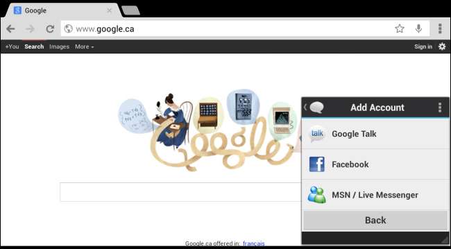Los programas de chat de escritorio de la vieja escuela como ICQ, AIM, MSN, Pidgin, Trillian y los demás no te obligaron a entrar en un modo de chat de pantalla completa, pero la mayoría de las aplicaciones de tu tableta sí. LilyPad le ofrece una ventana de chat flotante que le permite chatear en Google Talk, Facebook y Windows Live Messenger (MSN). Los desarrolladores prometen soporte futuro para AIM, Yahoo y Jabber.
