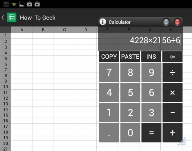 La aplicación de calculadora de Android predeterminada se ve un poco ridícula en el modo de pantalla completa en una tableta. Tratar AirCalc o Calculadora de flotación en cambio, ambos son gratuitos y le permiten usar una calculadora mientras usa otra aplicación.