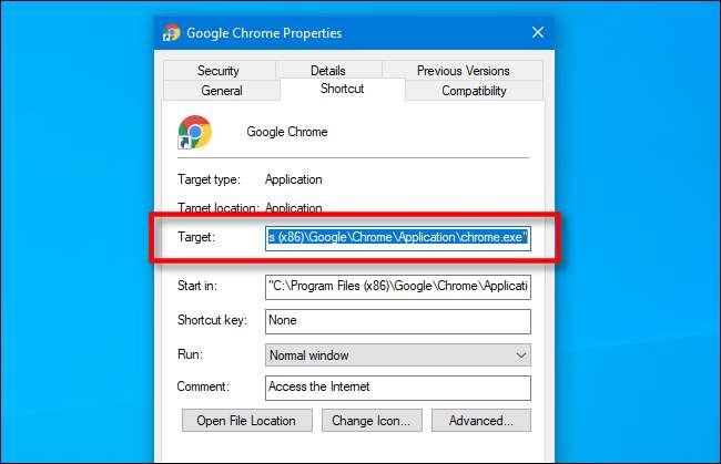 Aparece una ventana Propiedades para el acceso directo. En la pestaña "Acceso directo", busque el campo de texto "Destino".