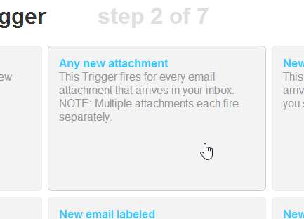 Al igual que con otros canales IFTTT, existen varios activadores de Gmail. Como estamos interesados en trabajar con archivos adjuntos, haga clic en el cuadro "Cualquier archivo adjunto nuevo".