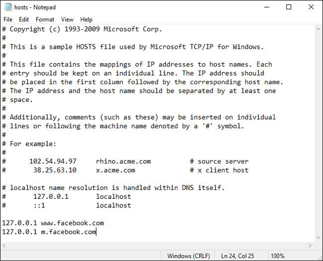 Si bien el método para acceder al archivo de hosts difiere entre los sistemas operativos, los cambios que harán no hacerlo. Los cambios que realizas dependen de qué sitio web estás tratando de bloquear. Para bloquear los sitios web de escritorio y móviles de Facebook, agregarías: