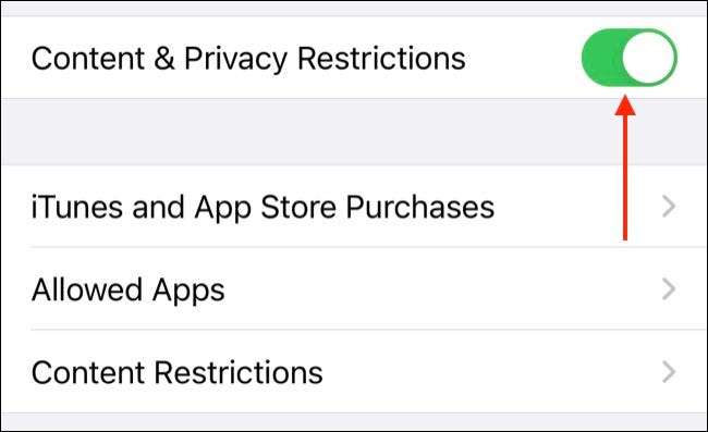Habilitar el "contenido y amplificador; Restricciones de privacidad "Alternar en la parte superior de la pantalla e ingresar un código de acceso si se le solicita. Este será un código de acceso de pantalla que haya configurado en el pasado. Ocultar este código de acceso de cualquier persona que no quiera eliminar sus restricciones, como los niños.