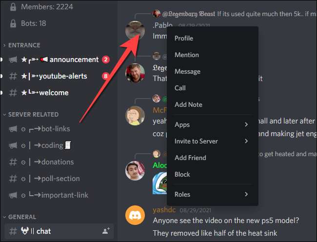 Encuentre a la persona que desea bloquear desde cualquier canal de texto, y, si está en una PC, haga clic con el botón derecho en la foto del perfil o el nombre de usuario.