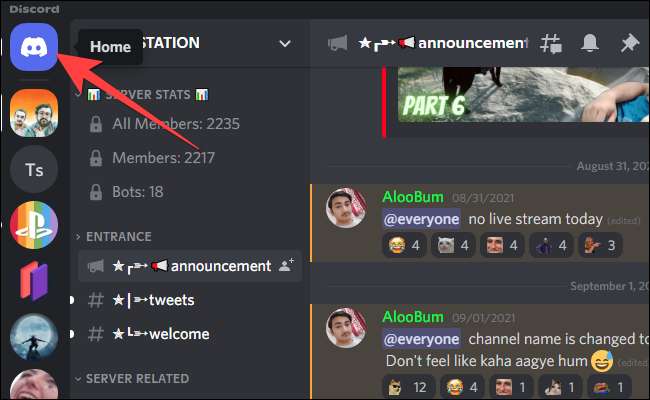 Abra la aplicación de la discordia y haga clic en el botón Inicio (logotipo de la discordia) en la esquina superior izquierda de la ventana.