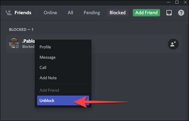 Haga clic con el botón derecho en la persona que desea desbloquear y seleccione "Desbloquear" en el menú que se abre.