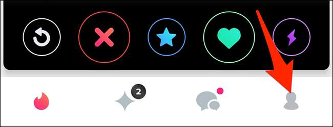 Para hacer esto, abra la aplicación Tinder en su teléfono Android o iPhone. En la barra en la parte inferior, toque el icono del perfil (el último icono en la fila).