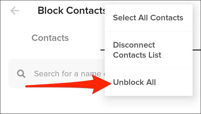 Para desbloquear a todos sus usuarios bloqueados, toque el menú de tres puntos en la esquina superior derecha de la aplicación y seleccione "Desbloquear todo".