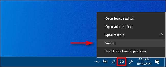 Puede iniciar esta herramienta desde el icono del altavoz en el área de notificación de la barra de tareas, que está opuesta al botón de inicio. Primero, haga clic con el botón derecho en el icono del altavoz y seleccione "Sonidos" en el menú que aparece.