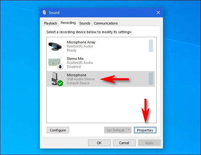 Verá una lista de micrófonos instalados en su sistema. Seleccione el que desea ajustar, luego haga clic en el botón "Propiedades".