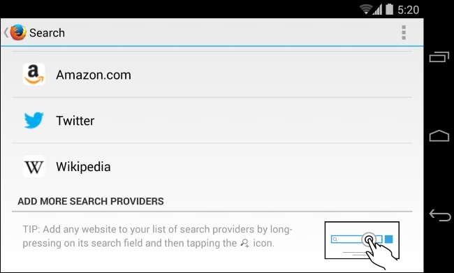Firefox para Android facilita la adición de un motor de búsqueda desde cualquier sitio web, simplemente mantenga presionado un campo de búsqueda y agréguelo.