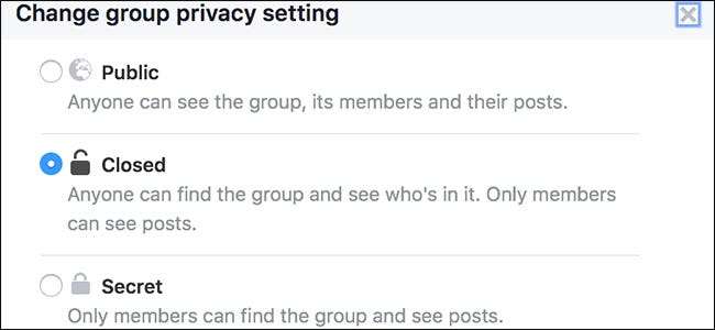 Los grupos pueden tener uno de tres niveles de privacidad diferentes: Público, Cerrado y Secreto.