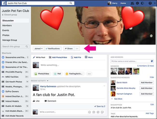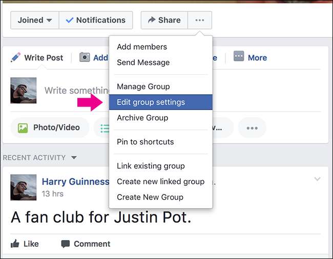 Abra su grupo de Facebook y haga clic en los tres pequeños puntos justo debajo de la foto de portada.