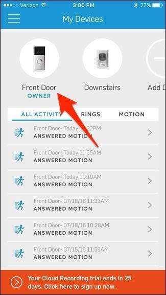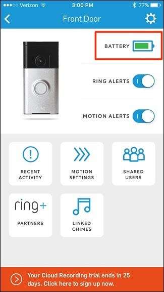 En primer lugar, puede ver cuánto jugo le queda a su Ring Doorbell abriendo la aplicación Ring en su teléfono y tocando el dispositivo en la parte superior de la pantalla.