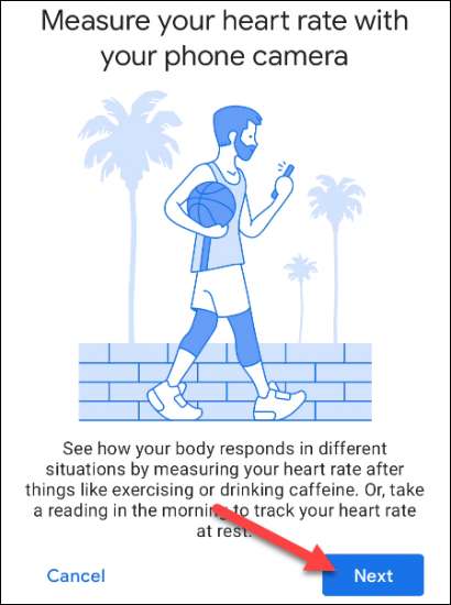 A continuación, la pantalla le explicará que usará la cámara del teléfono para medir la frecuencia cardíaca. Toque "Siguiente" para continuar.