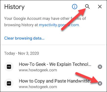 Si desea borrar entradas específicas, puede tocar el icono de búsqueda en la parte superior. Toque el "X" junto a cualquier entrada para eliminarla.