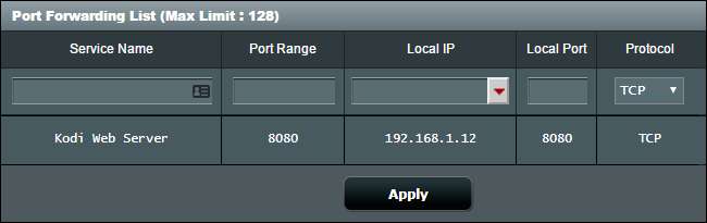 Por último, deberá configurar el reenvío de puertos para su caja Kodi. Esto diferirá de un enrutador a otro, pero puede mira nuestra guía aquí para más información. Simplemente reenvíe cualquier puerto externo a la dirección IP local de su caja Kodi (en mi caso, 192.168.1.12) y al puerto local (8080 por defecto).
