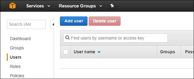 Ahora dirígete al Página de gestión de identidad y acceso (vuelva a iniciar sesión en AWS si es necesario) y haga clic en la pestaña "Usuarios" en el lado izquierdo. Haga clic en el botón "Agregar usuario".