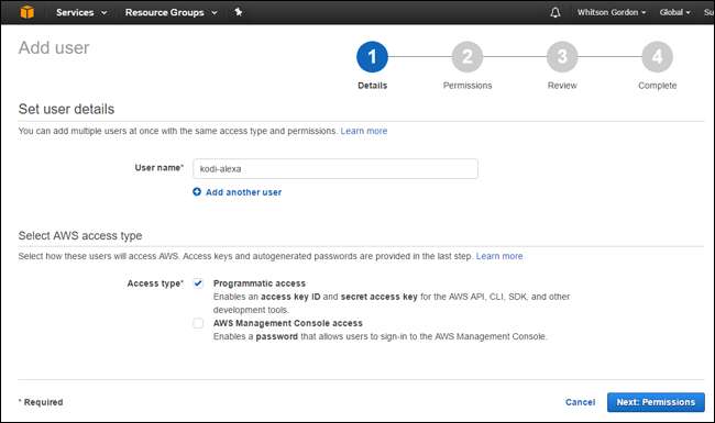 Cree un nuevo usuario con el nombre de usuario que desee. Marque la casilla "Acceso mediante programación" y haga clic en "Siguiente: Permisos".