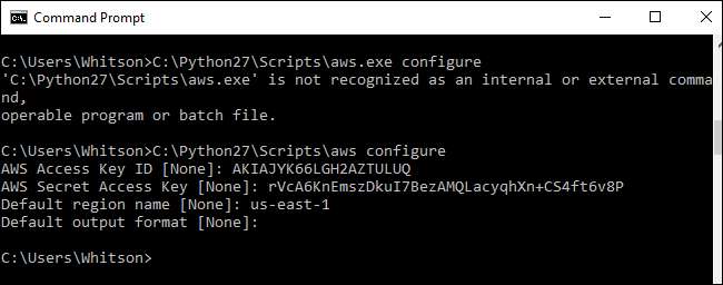 Pegue su ID de clave de acceso y su Clave de acceso secreta cuando se le solicite. Cuando se le solicite su nombre de región predeterminado, escriba
