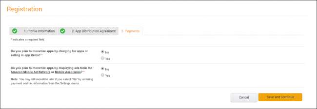 Para comenzar, configure una cuenta de desarrollador de Amazon gratuita. Dirigirse a esta página , inicie sesión con su cuenta de Amazon y regístrese para obtener una cuenta de desarrollador. Complete los campos obligatorios, acepte los términos y diga "No" cuando se le pregunte si va a monetizar sus aplicaciones.