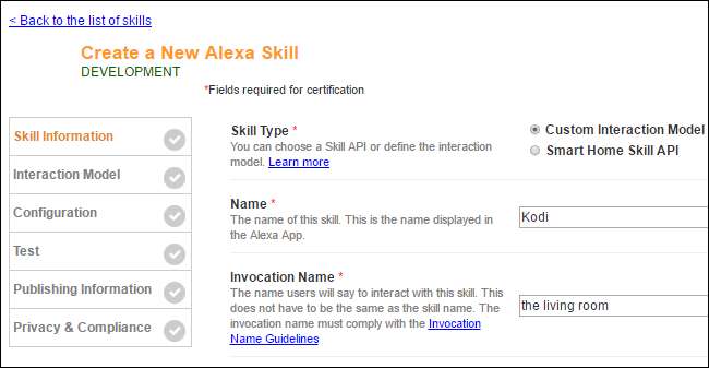 Dale un nombre a tu habilidad (llamé a la mía "Kodi") y dale un nombre de invocación. Esto es lo que dirá cuando quiera invocar un comando. Por ejemplo, el nombre de mi invocación también es "la sala de estar", lo que significa que tendré que decir "Pedirle a la sala de estar que ..." para dar comandos a Alexa para mi centro multimedia.