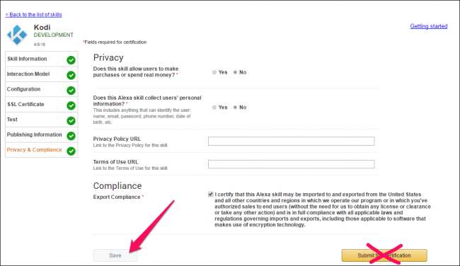 En la página final, elija "No" para ambas preguntas de privacidad y marque la casilla de Cumplimiento. Haga clic en el botón "Guardar" cuando haya terminado. NO haga clic en el botón "Enviar para certificación".