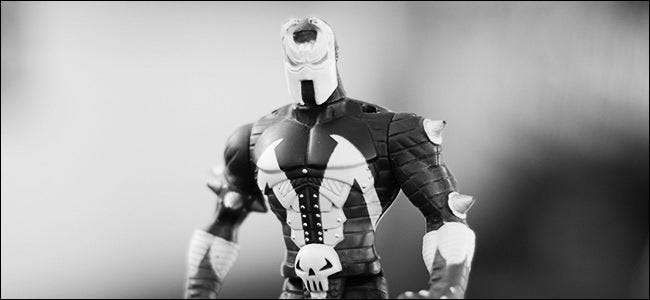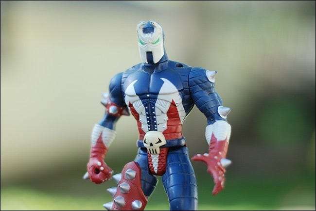 Armados con ese conocimiento, podemos predecir fácilmente lo que sucederá cuando usemos el ajuste preestablecido Blanco y negro con filtro rojo, ¿verdad? Los detalles rojos en la figura de Spawn serán más claros y las partes azules serán significativamente más oscuras. Apliquemos el filtro y veamos: